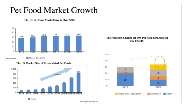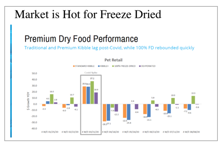 The freeze-dried sub-category in the overall pet food products market is by far the fastest growing factor play in the space, with 2020 representing a breakout year for the sub-category.