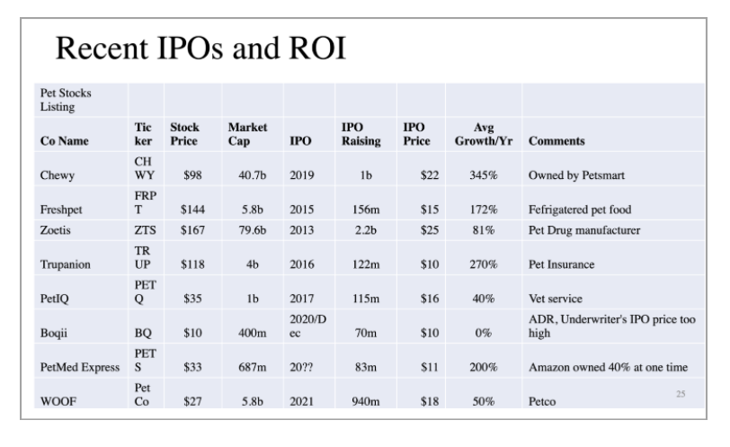 Zoetis Inc (NYSE:ZTS), Freshpet Inc (NASDAQ:FRPT), and recent IPO Petco Health and Wellness Company Inc (NASDAQ:WOOF) offer similar success stories.