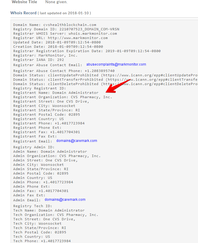 A new domain registration has popped up in the name of cvshealthblockchain.com. Interestingly, this domain is registered with the same address as CVS Pharmacy, Inc with the following details: