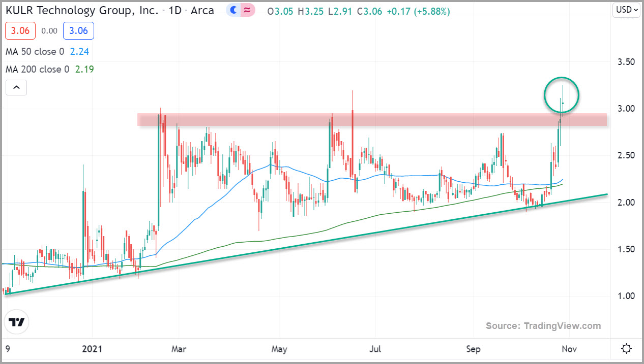 The KULR chart over the past year shows a steady unbroken upward trend that has consolidated in a lateral range over the past seven months, coiling up under the $2.90/share level. This week shares of the stock are breaking out above that level on surging volume.