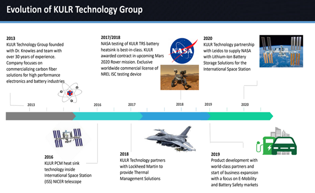 Leveraging the company’s roots in developing breakthrough cooling solutions for NASA space missions and a strong intellectual property portfolio, KULR enables leading aerospace, electronics, energy storage, 5G infrastructure and electric vehicle manufacturers to make their products cooler, lighter and safer for consumers.