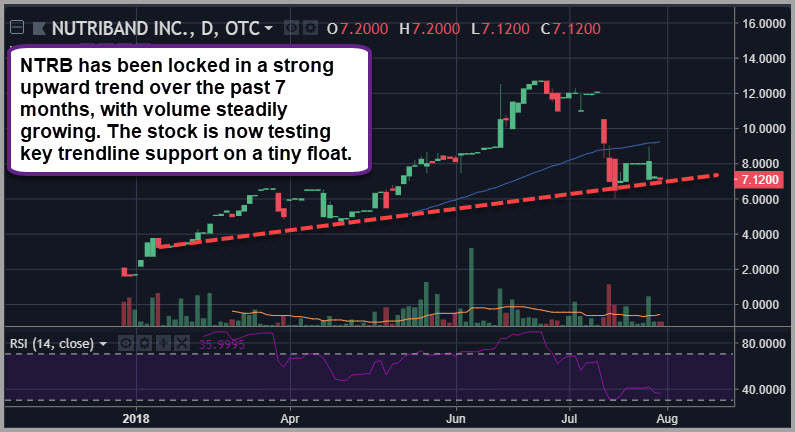 NTRB trades on a tiny float (under 2.5M shares) and finally pulled back to test trendline support and give us a chance to possibly climb on the elevator before it potentially heads up to the next floor. Just a simple flash back up to test recent highs could represent as much as 80% on the upside.